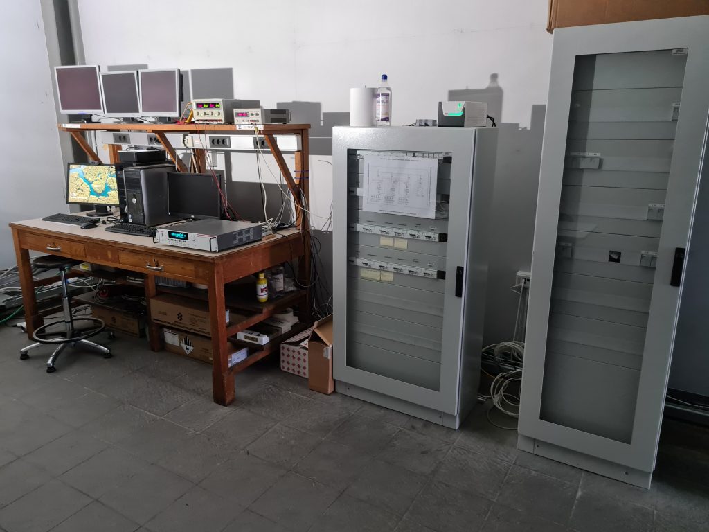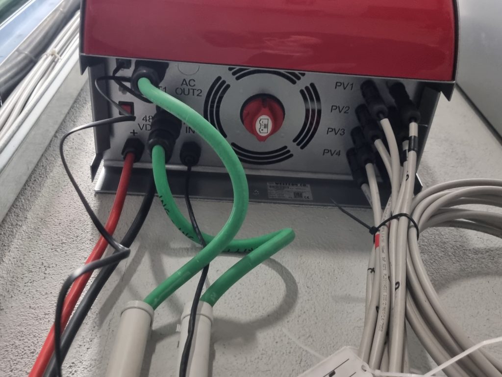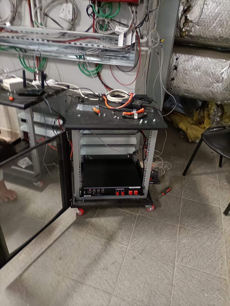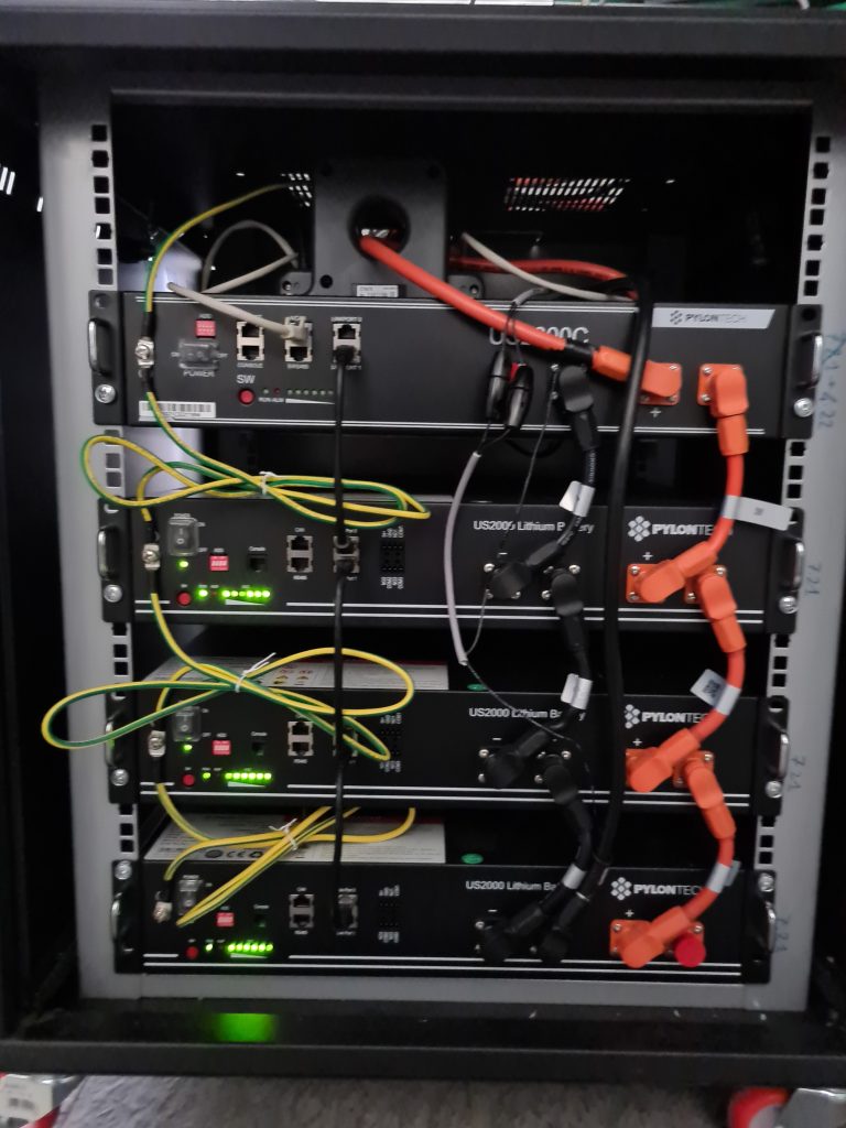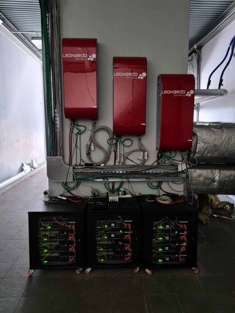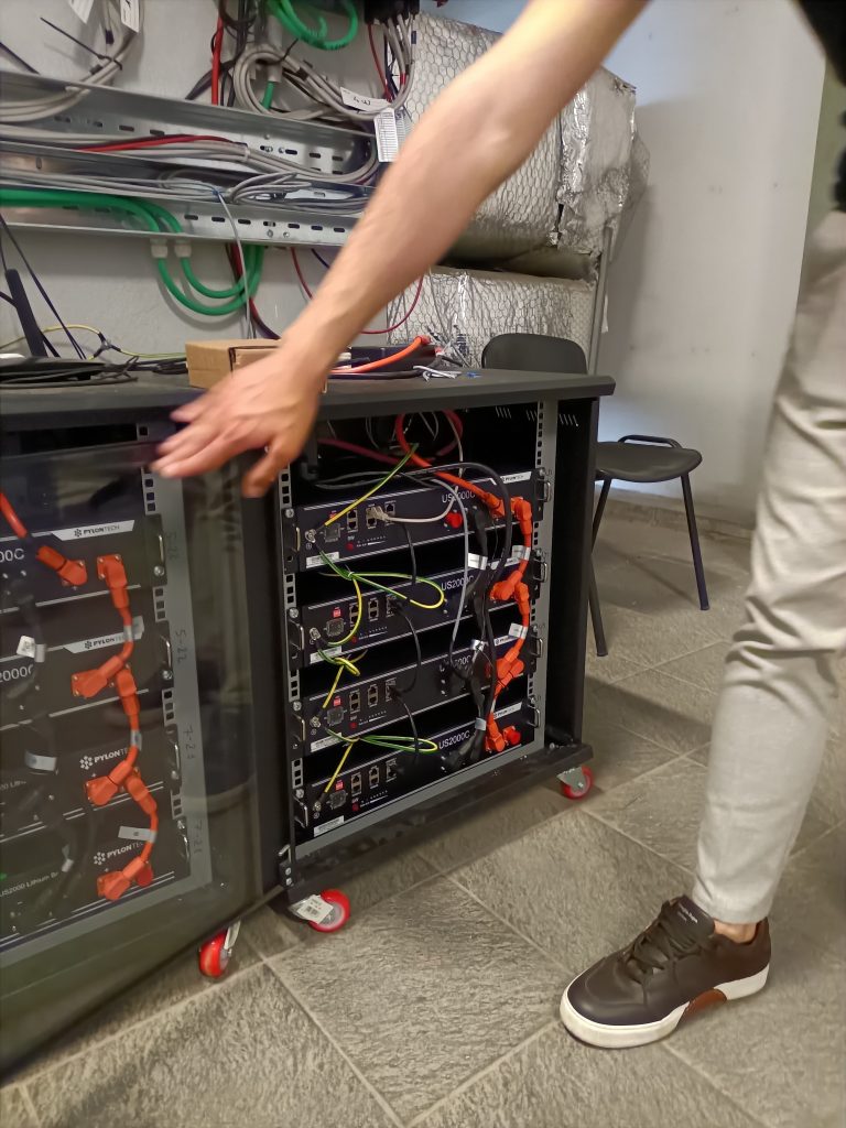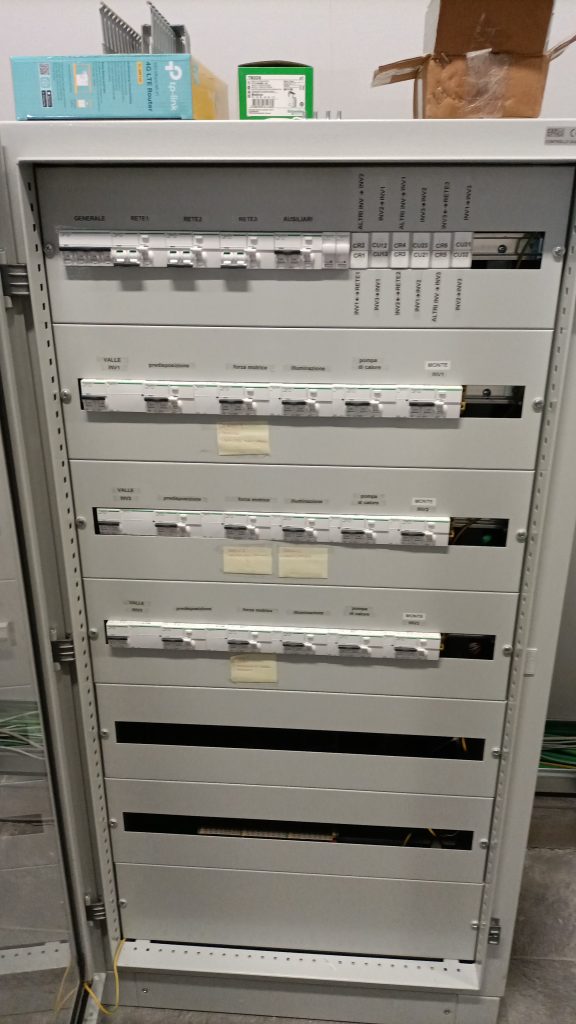 Quadro ACSistema di controlloRack di batterie al litio (circa 10 kWh)Particolare del convertitore – unità 1Quadro AC Vista dei generatori fotovoltaiciIngrandimento sui generatoriIngrandimento rack batterieunità di conversione e rack batterie