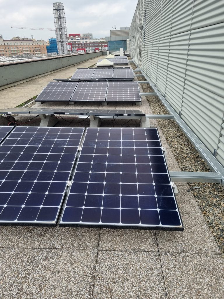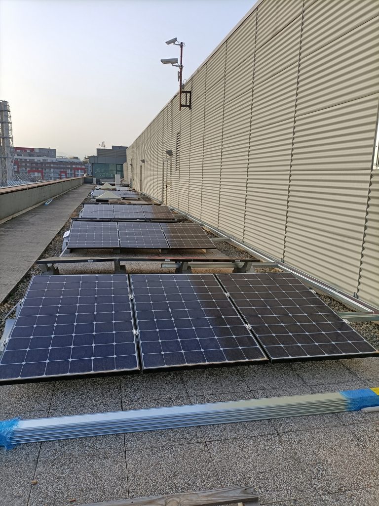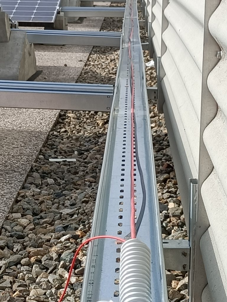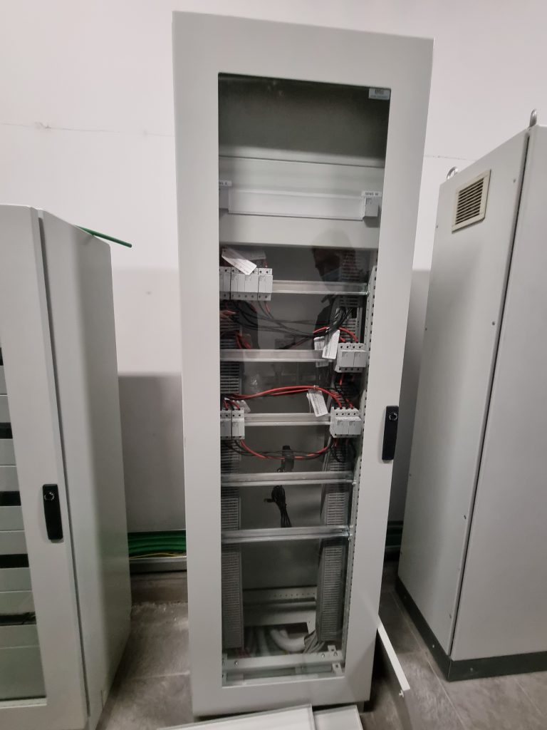Montaggio di un rack di batteriePosa dei caviQuadro DC in fase di montaggioVista dei generatori fotovoltaici durante la realizzazione dell’impianto – lato est